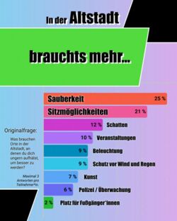 Die Insel-Schütt-Schule liegt im Untersuchungsgebiet. Für dieses Beteiligungsformat kooperierten wir mit der Schulleitung und dem dortigen Schulsozialarbeiter, der uns in der Durchführung unterstützte. Schüler*innen dieser Schule halten sich mehrmals wöchentlich in der Altstadt auf, weshalb wir hier keine farbigen Klebepunkte verwendeten. Im Gegensatz zu den anderen Beteiligungsformaten hatten wir hier eine hohe Chance, "Jugendliche, die in der Altstadt wohnen“ zu erfassen. Diesen Jugendlichen haben wir einen roten Stift für die Strichlisten gegeben.