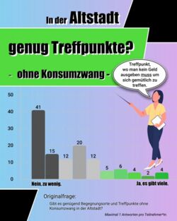 Mit dem Ziel, dass auch junge Menschen außerhalb von formalen Bildungskontexten die Chance haben sich zu beteiligen, haben wir vier offene Nachmittage im "Jugendbüro Team Altstadt“ eingeplant. Hier konnten Jugendliche ausgehängte Plakate niederschwellig und pädagogisch begleitet ausfüllen. Leider nahm kein Jugendlicher dieses Angebot wahr, was in der Retrospektive die Notwendigkeit unseres aufsuchenden Ansatzes in abstrakteren Jugendbeteiligungsprozessen unterstreicht.