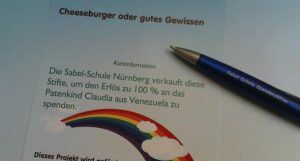 Der Gewinn der Aktion kommt zu 100% dem Patenkind Claudia aus Venezuela zu gute, die in einem SOS Kinderdorf wohnt. Wir haben für den Verkauf Plakate und Flyer gestaltet, damit man weiß warum man unsere Kulis kaufen sollte.