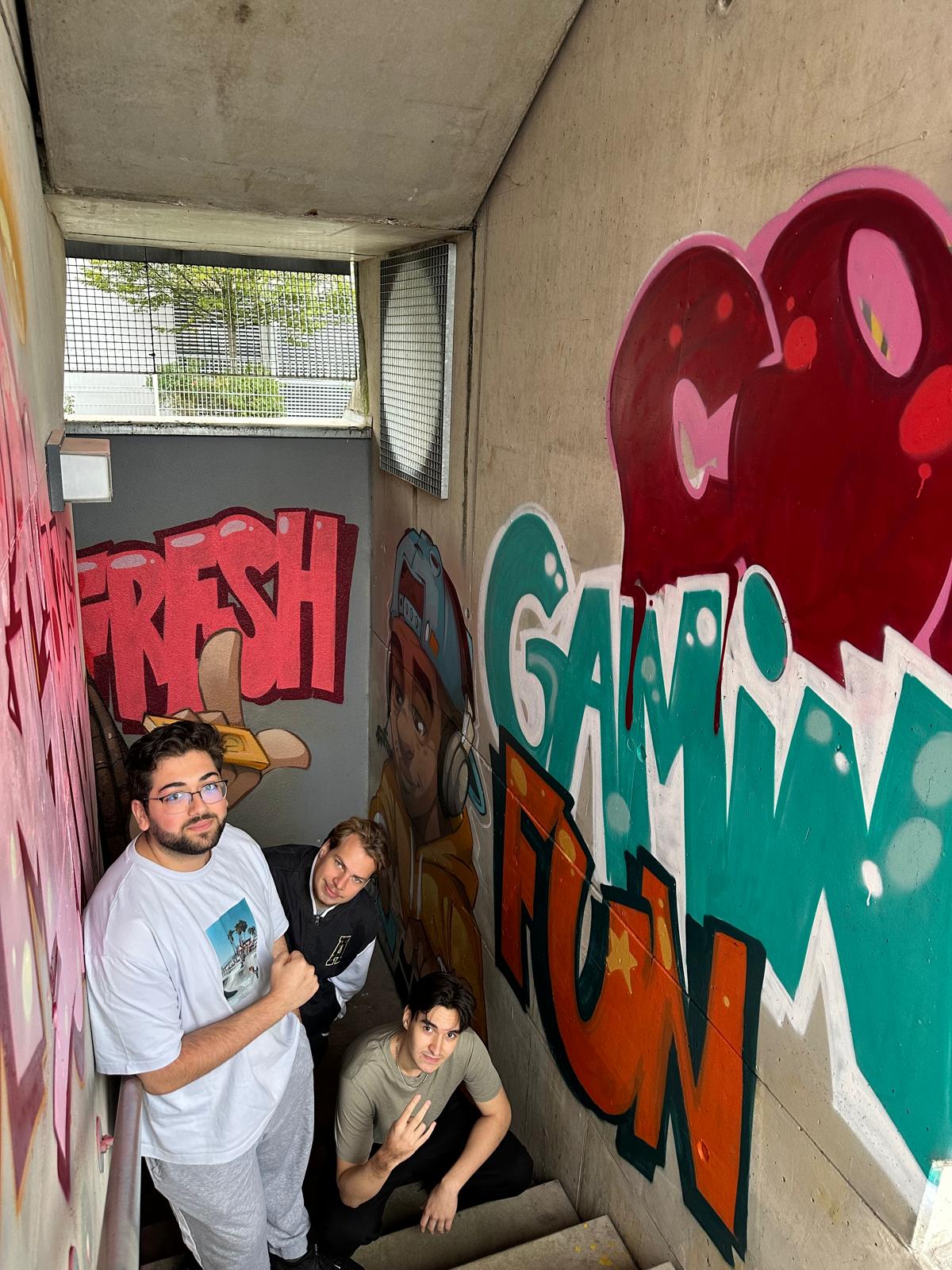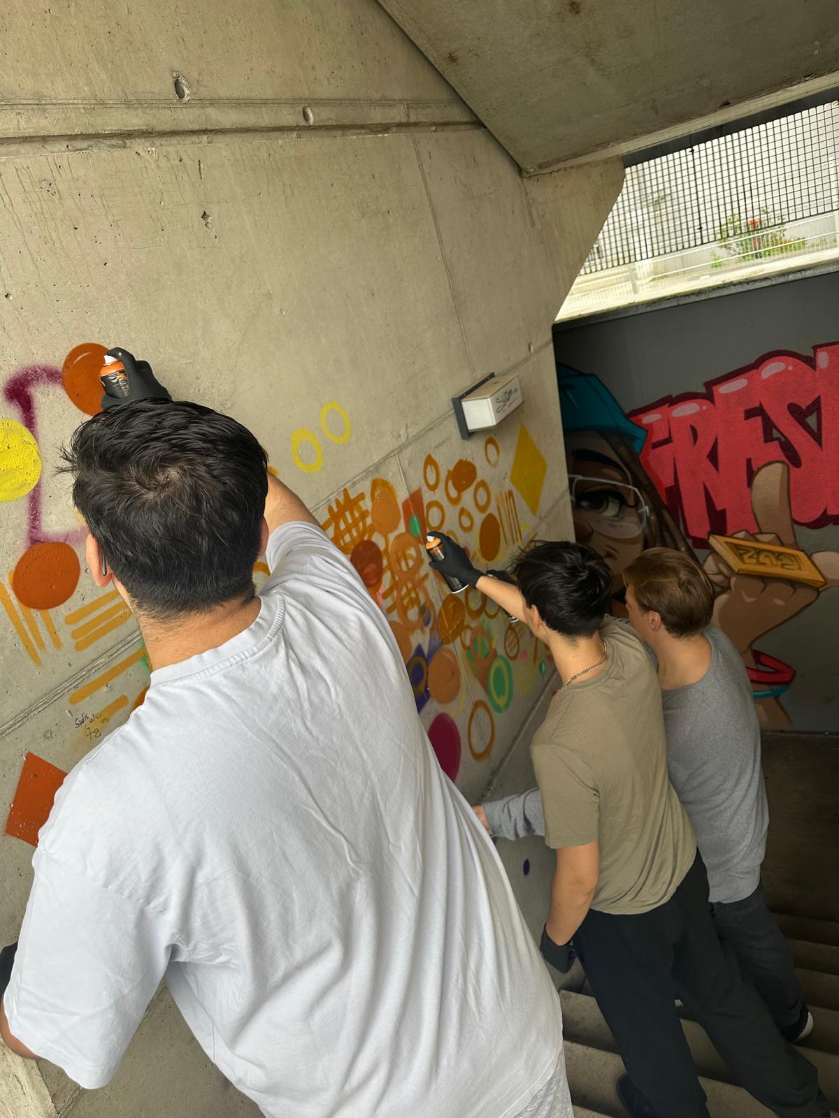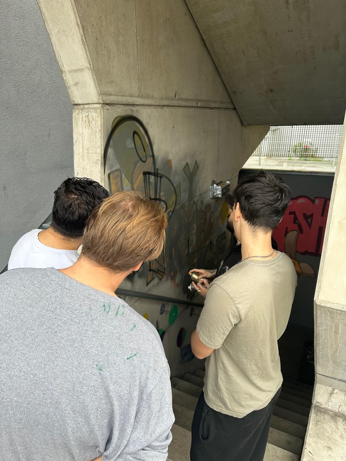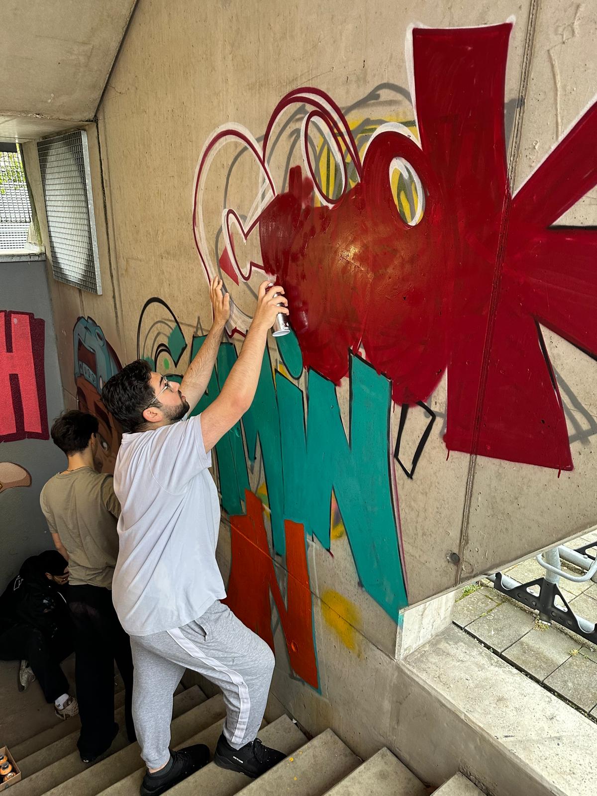 Danach haben wir gemeinsam mit dem Künstler uns mehrere Wörter überlegt, die wir an die Wand sprühen wollten. Daraufhin haben wir eine Skizze erstellt und erstmal an der Wand vorgezeichnet. Anschließend haben wir alles mit verschiedenen Farben ausgefüllt.